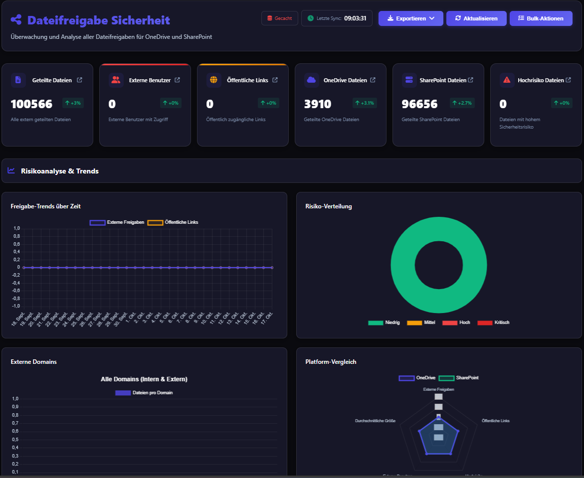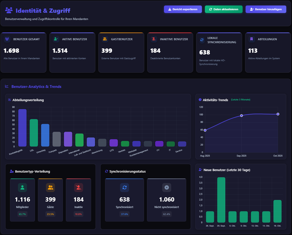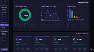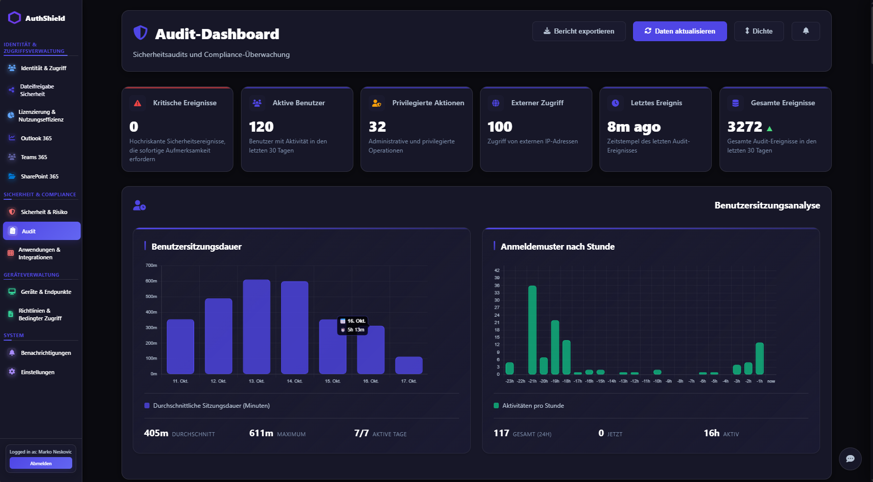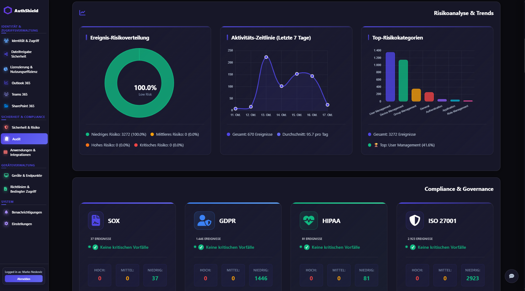 Umfassender Einblick in Aktivitäten, Risiken, Rollen und Freigaben – jederzeit exportierbar als PDF, CSV oder JSON.